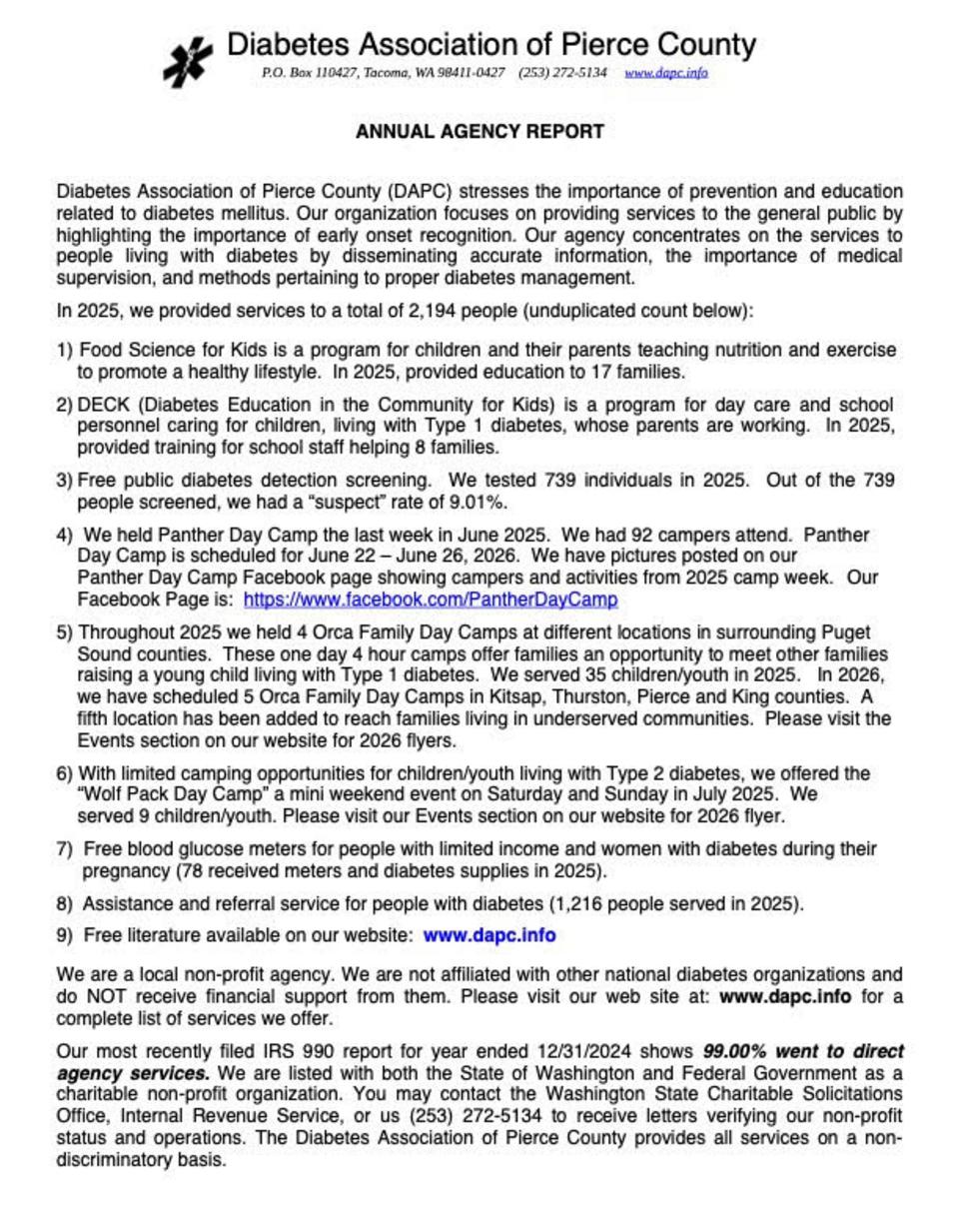 2. Diabetes Association of Pierce County (DAPC) does not monitor or endorse, and is not responsible for any agency, research project, support group, class or event except for the events in which DAPC is the sponsoring agent, e.g. Panther Day Camp, diabetes self-care workshops, and public detection screenings.